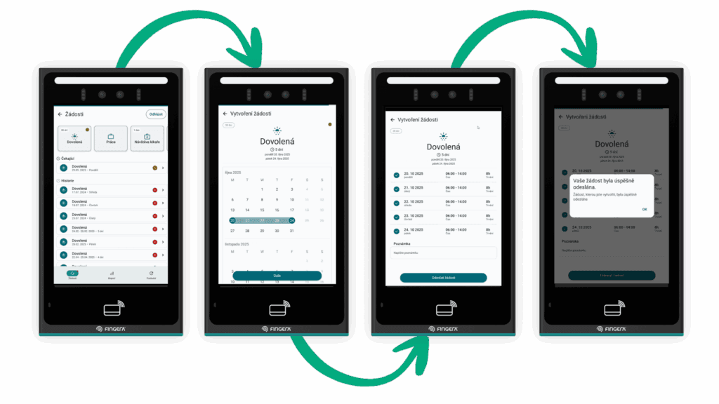 Fingera přináší nové rozšíření: Žádosti o nepřítomnost přímo na docházkových terminálech, které zajišťuje úplnou digitalizaci procesů a snižuje zátěž jak pro zaměstnance, tak pro personální či účetní oddělení.